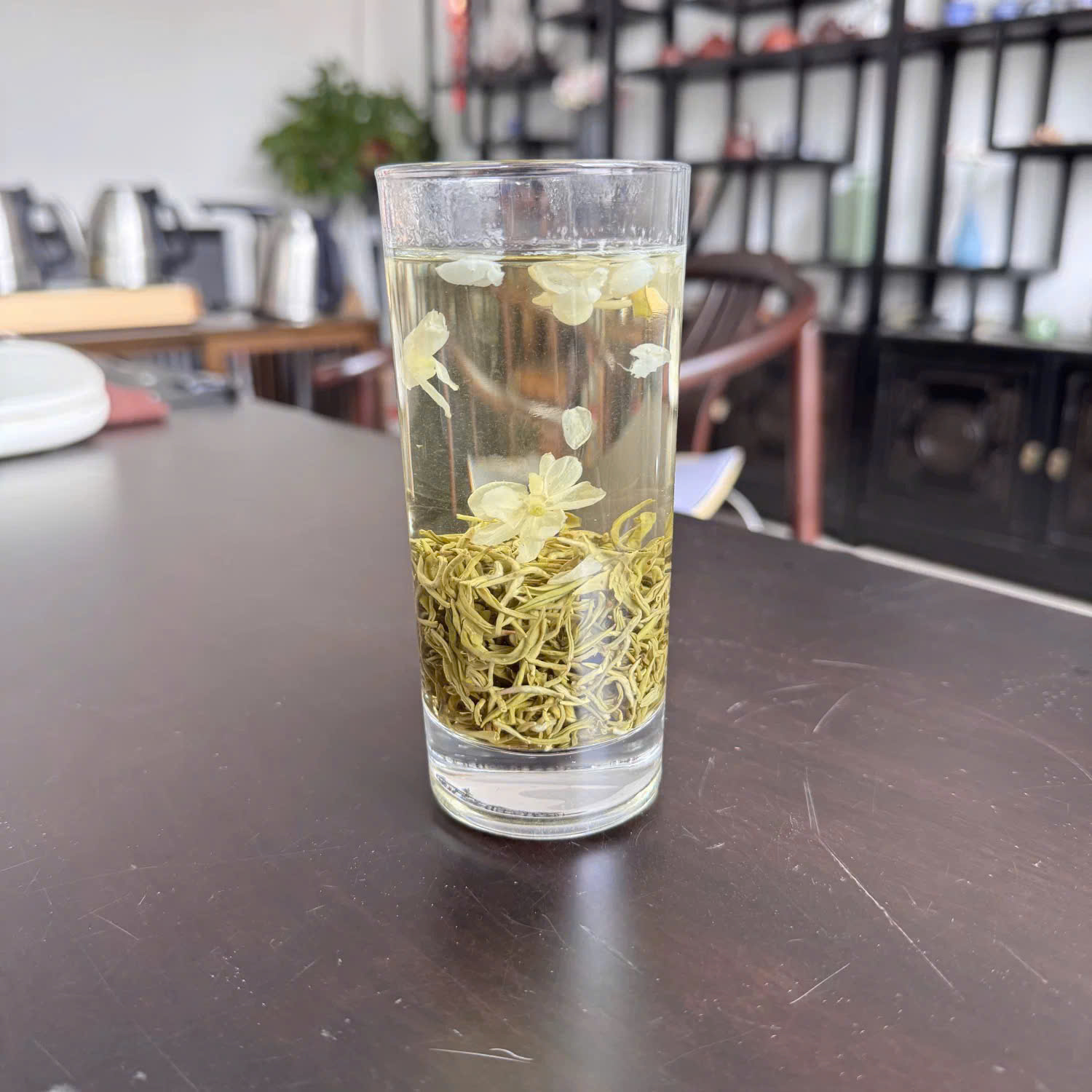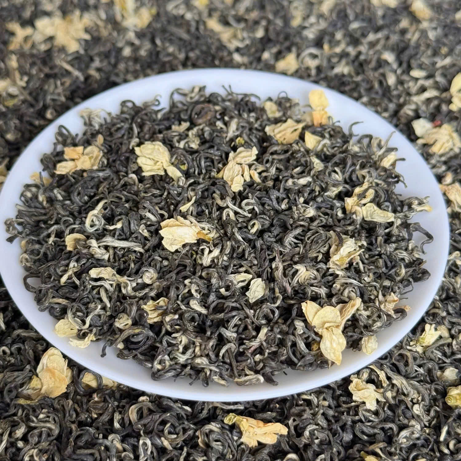 - Hình thức: Hoa nhài trắng ngần điểm xuyến trên nền trà xanh, tựa như bức tranh thủy mặc tao nhã.